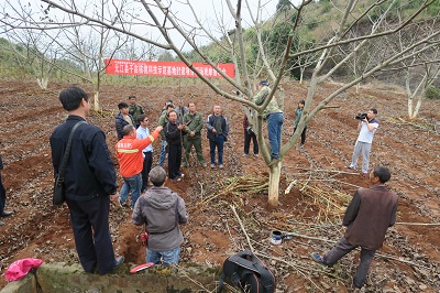 在项目组人员的陪同下,参与观摩的人员首先参观了业白核桃示范基地核桃树的生长情况后,又参观了林农对核桃树进行修剪、开挖施肥沟及病虫害防治等抚育管理的现场演练;随后再到它吉克核桃示范基地参观了核桃品种改接换优及核桃树的抚育管理。在参观过程中,大家边走边看,并向管理人员了解核桃挂果情况,详细咨询了核桃修剪、品种改接换优、病虫害防治等问题,同时,对如何做好冬季核桃抚育管理进行了现场交流。